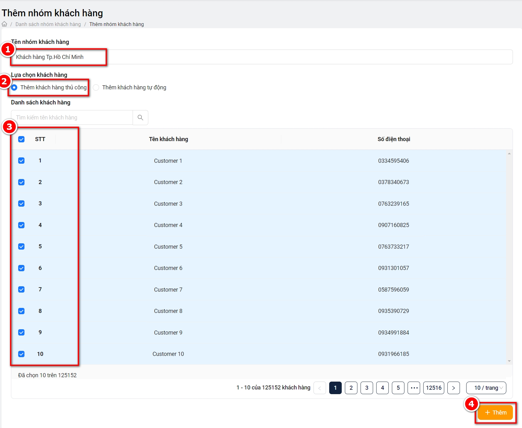 Trường hợp chọn Thêm khách hàng thủ công(2) → chọn khách hàng để thêm vào nhóm(3) → chọn Thêm(4).