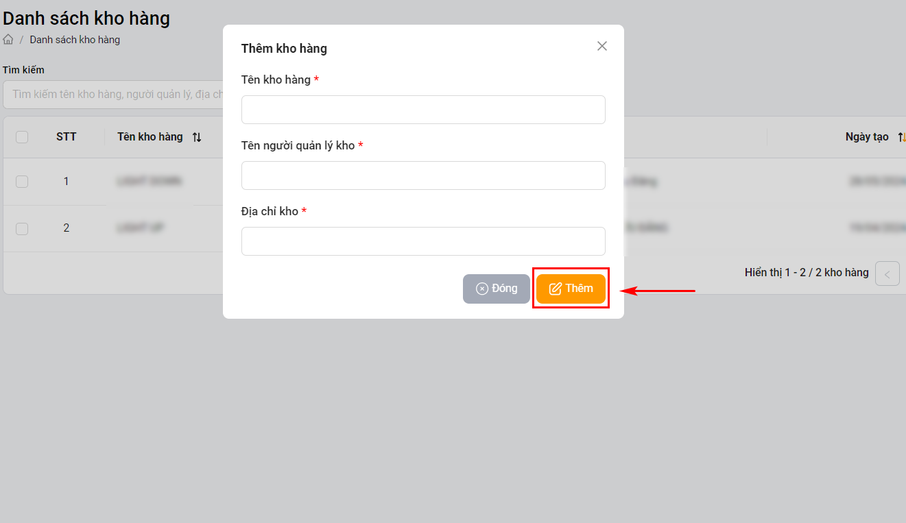 Bước 3 : Click Thêm để hoàn tất việc thêm kho hàng .