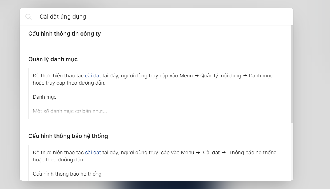 Ví dụ: Cần tìm thông tin về kiểm kho hoặc cần Hướng dẫn kiểm kho -> nhập từ khoá "Cài đặt ứng dụng". Những kết quả đầu tiên chứa chính xác từ khoá "kiểm kho".