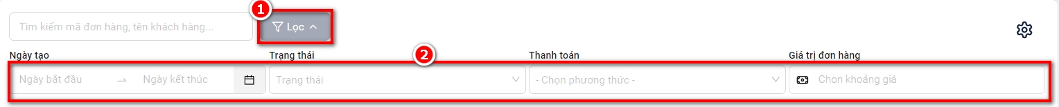 Có thể lọc đơn hàng theo trạng thái, ngày tạo, phương thức thanh toán và giá trị đơn hàng bằng các bộ lọc trên thanh menu: